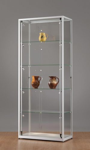 Aluminium Profil 24 mm Eckig, Unteres Profil 40mm, oberes Profil 24mm, Rundum ESG-Sicherheitsglas, Drehtür aus ESG-Sicherheitsglas mit Zylinderschloss, LED-Beleuchtung auf Schiene stufenlos verstellbar, Decke aus ESG-Sicherheitsglas, Boden aus melaminierter Platte, Fachböden stufenlos verstellbar, Fertig montiert