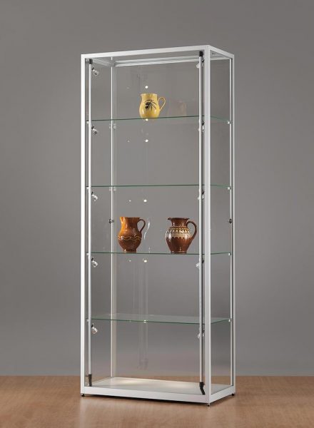 Aluminium Profil 24 mm Eckig, Unteres Profil 40mm, oberes Profil 24mm, Rundum ESG-Sicherheitsglas, Drehtür aus ESG-Sicherheitsglas mit Zylinderschloss, LED-Beleuchtung auf Schiene stufenlos verstellbar, Decke aus ESG-Sicherheitsglas, Boden aus melaminierter Platte, Fachböden stufenlos verstellbar, Fertig montiert