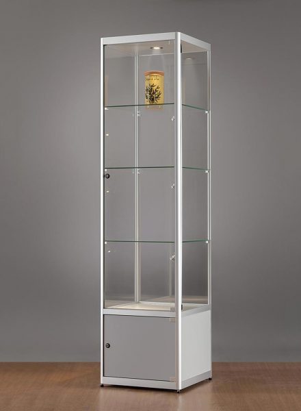 Glasvitrine Standard LED-Beleuchtung auf Schiene stufenlos verstellbar und Halogenbeleuchtung in Decke mit Unterschrank 2x Drehtür 500(B)x500(T)x2000(H)mm SILBER