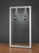 Aluminium Profil 150 mm viertel Kreis, Unteres- und oberes Profil 60mm, Rundum ESG-Sicherheitsglas, Schiebetüren mit Druckknopfschloss und Aushebesicherung, Griffmülden in beiden Türen, Türen Rollengelagert (Stahl), 2x 7 Watt Powerled in Decke, Boden und Decke aus melaminierter Platte, Fachböden stufenlos verstellbar, Fertig montiert